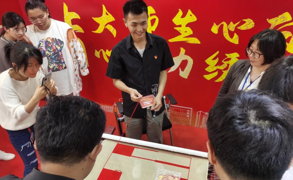 最后,李娟老师和同学们一起参与了动手绣党旗的活动。大家展开绣布,将针线按针法上下穿梭,在一针一线中传承爱国爱党的红色精神,也将对党的深情祝福融入这一针一线之中,把对党和祖国的热爱、忠诚和敬意绣在手中的党旗上。