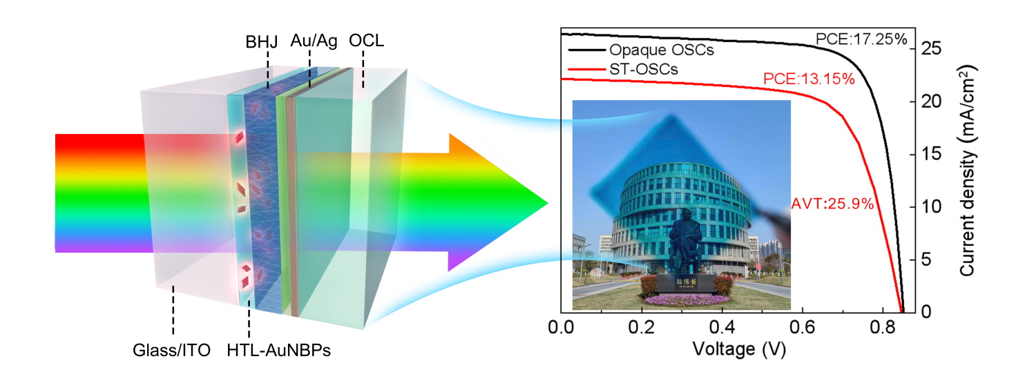 本工作针对ST-OSCs中高光学透过和高光电转换相互竞争这一核心矛盾开展了创新性研究。首先,优化活性层中聚合物给体和非富勒烯受体材料的配比,增强光敏层的近红外光吸收。其次,发展可溶液加工的基于金纳米双锥的空穴传输层,借助金纳米双锥诱导的局域表面等离激元共振效应和光散射效应进一步地提升光敏层在近红外区的光学吸收。最后,在ST-OSCs的顶电极上引入低/高介电常数的叠层光耦合层,优化器件的可见波段高透过率和近红外波段高反射率,实现兼顾光敏层光吸收、器件透明度和显色性的最优化设计。结合实验优化和工艺集成,协同提升ST-OSCs在可见光区的透过率和在近红外区的光电转换效率,获得了PCE达到13.15%、AVT达到25.9%的高性能半透明光伏器件。