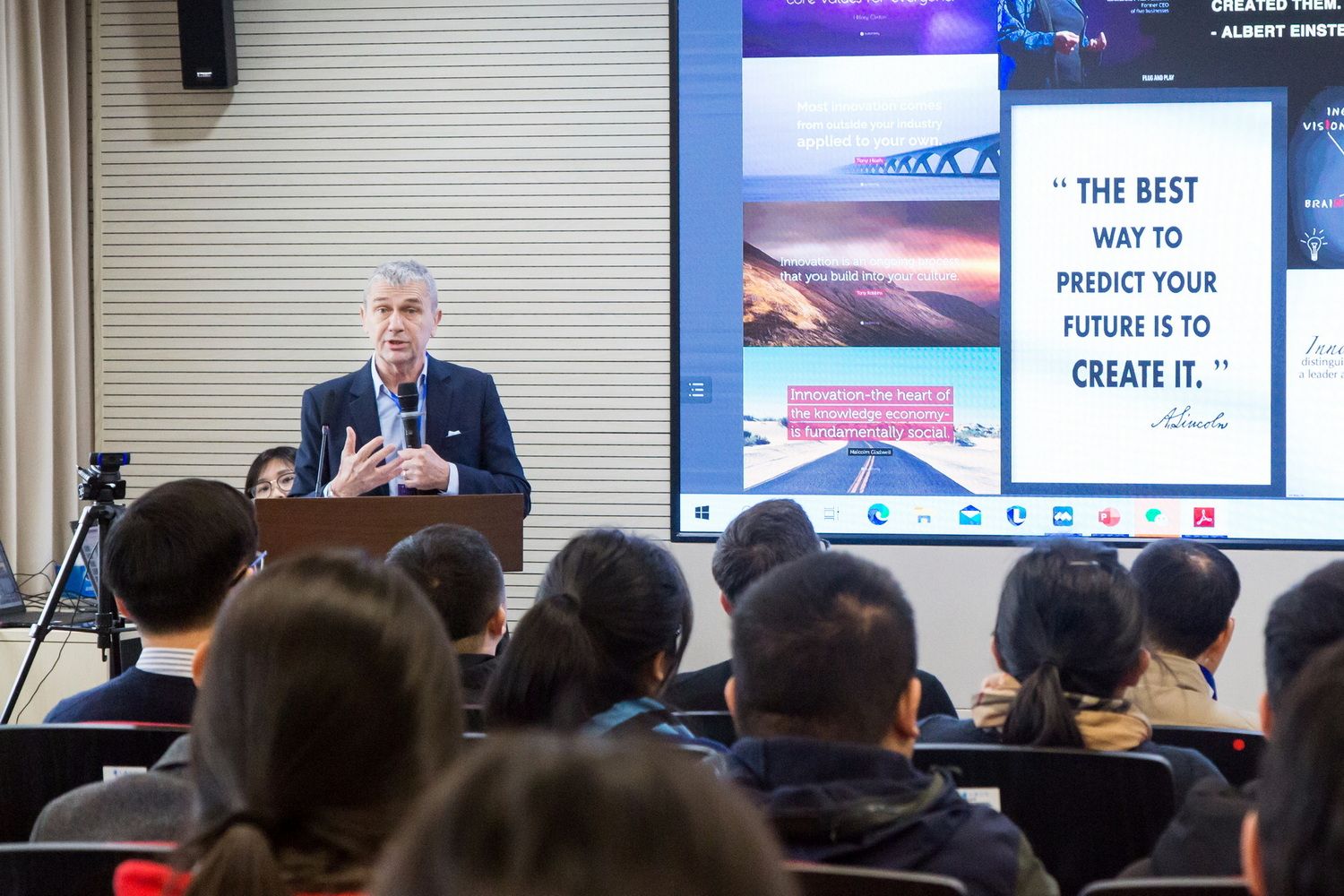 法方经理Fabien Pfaender的致辞向与会同学们分享他对创新的理解,也希望我们能拥有全球视野,发挥国际化的思维优势,更好地完成挑战,一如往届赛出精彩、赛出成果。