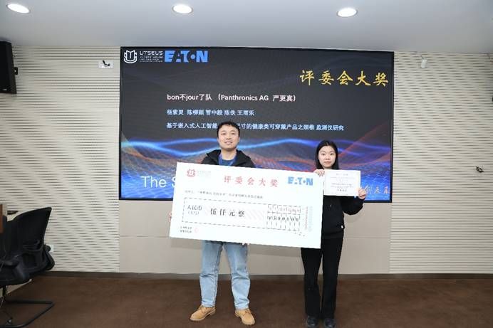 来自合作企业的苏敬先生、王威先生和史佳云女士分别向创意赛道的获奖战队颁发了一、二、三等奖获奖证书和奖金。伊顿公司的刘海晨先生向bon不jour了战队颁发了本届大赛创意赛道的评委会大奖,并对该组的获奖项目“基于嵌入式人工智能,极小尺寸的健康类可穿戴产品之颈椎监测仪研究”进行了点评。