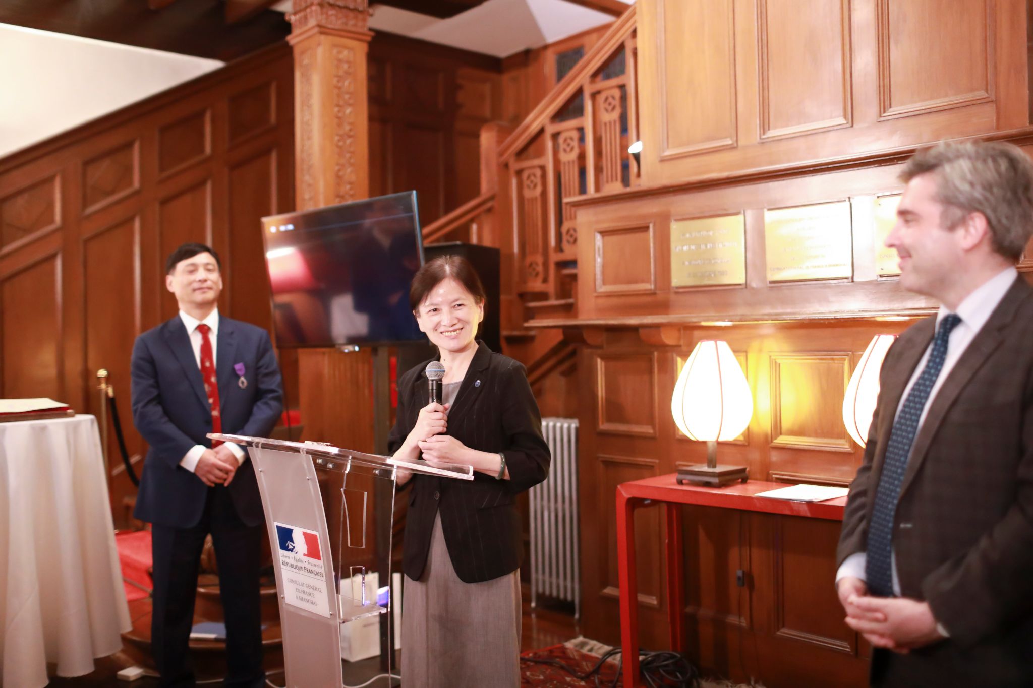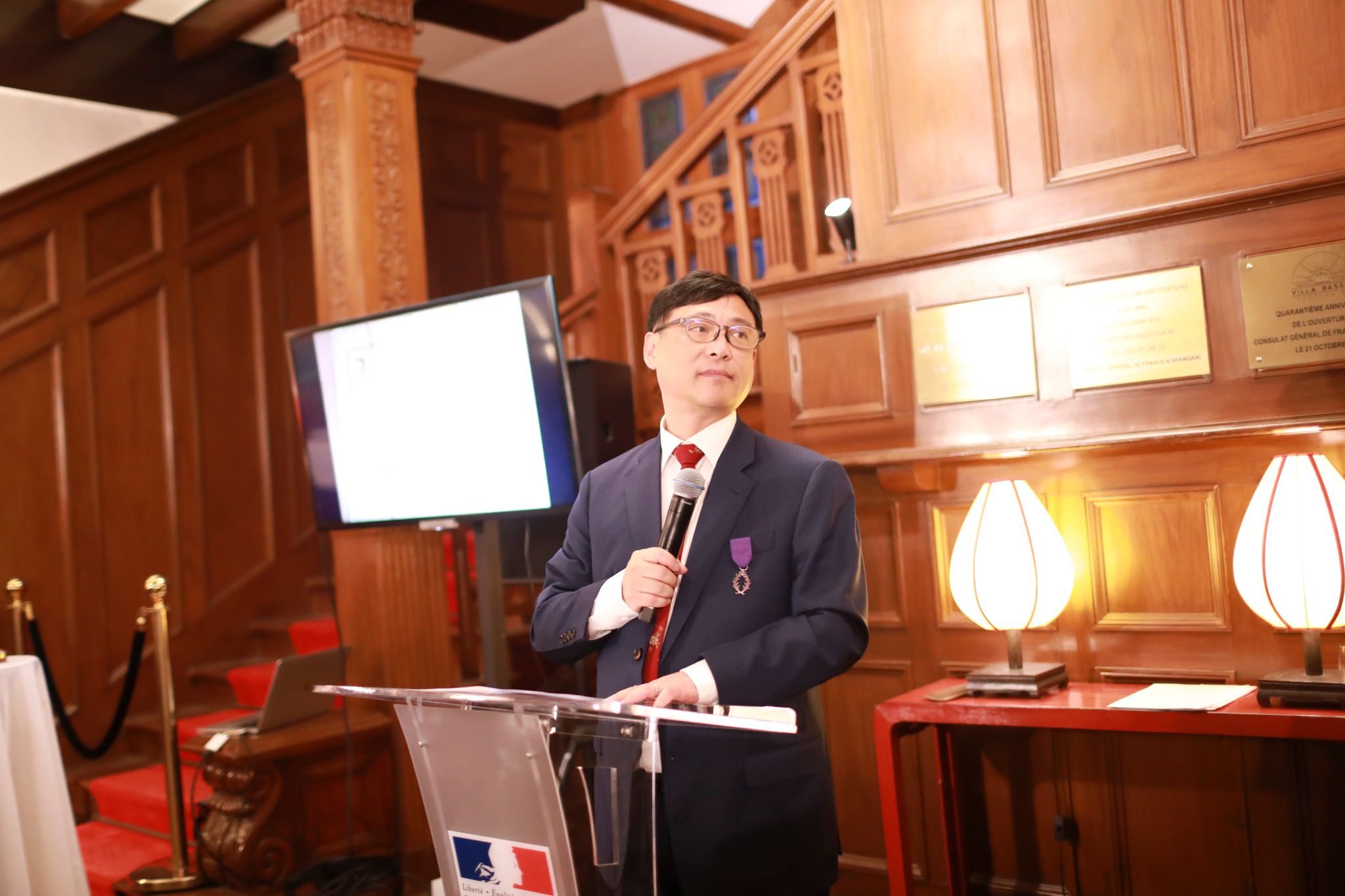 在庆祝仪式上,法国驻上海总领事王度(Joan Valadou)先生高度评价了刘宛予教授,并亲自为刘宛予教授佩戴勋章,他表示:“刘宛予教授是中法教育交流合作领域的杰出领军人物,他的杰出领导才能和卓越贡献为中法两国教育合作关系的发展奠定了坚实基础。我们衷心感谢他多年来对中法教育交流的奉献,并授予他法兰西学术棕榈骑士勋章,以表彰他的杰出成就。”