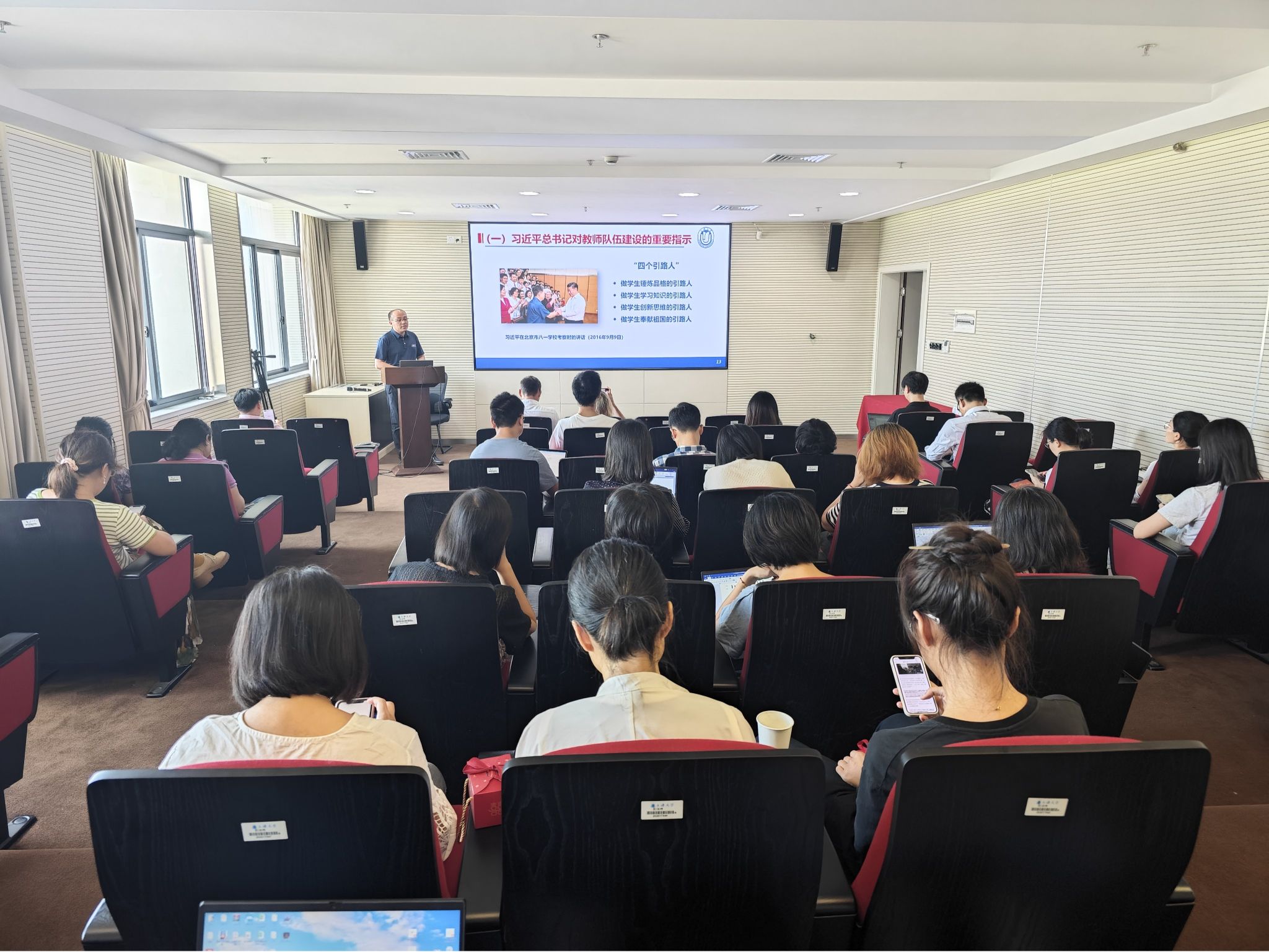副书记副经理周轶做了主题为“赓续红色基因,勇担育人使命,加强新时代师德师风建设”的主题分享。他从新时代加强师德师风建设的背景、新时代加强教师队伍建设的要求等方面进行了分享,特别强调了新时代上海高校教师职业行为十项准则,并对各类师德警示教育案例进行了分析,提醒广大教师要引以为戒,增强法治意识和师德意识,守牢教师职业行为规范的基本底线,弘扬高尚师德。