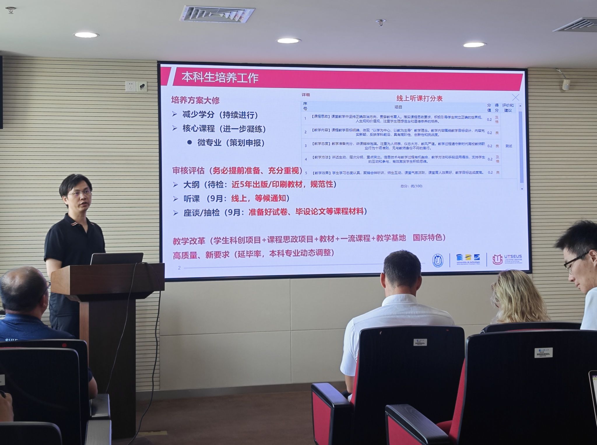 副经理王灵对本科生及研究生的培养工作、实验室建设与管理进行了介绍。重点强调了员工培养方案修订、本科生公司产品审核评估、研究生课程建设与企业实践、公司产品流程的规范、CTI认证相关教学管理制度的建立等方面的内容,并对后续教学改革的思路进行了阐释。副经理徐韬对于公司赴法选拔和签证情况、职工来院情况进行了介绍,并就本科专业动态调整、专业名称优化及本科学费调整等未来工作的重点进行了说明。