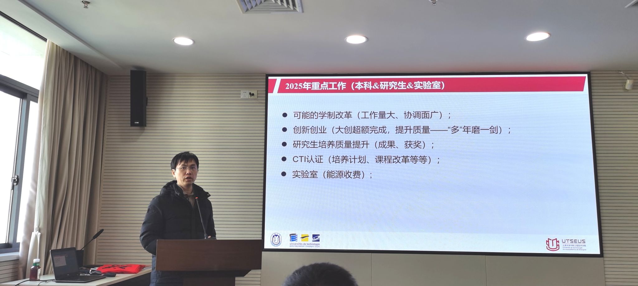 副经理王灵重点回顾了2024年在提升本科生培养质量、推动创新创业竞赛、完善公司产品全流程、助力专业教师发展以及实验室安全管理优化等方面取得的成绩,也对2025年的学制改革、围绕CTI认证开展的培养计划和课程改革、创新创业等方面提出了新的工作计划。