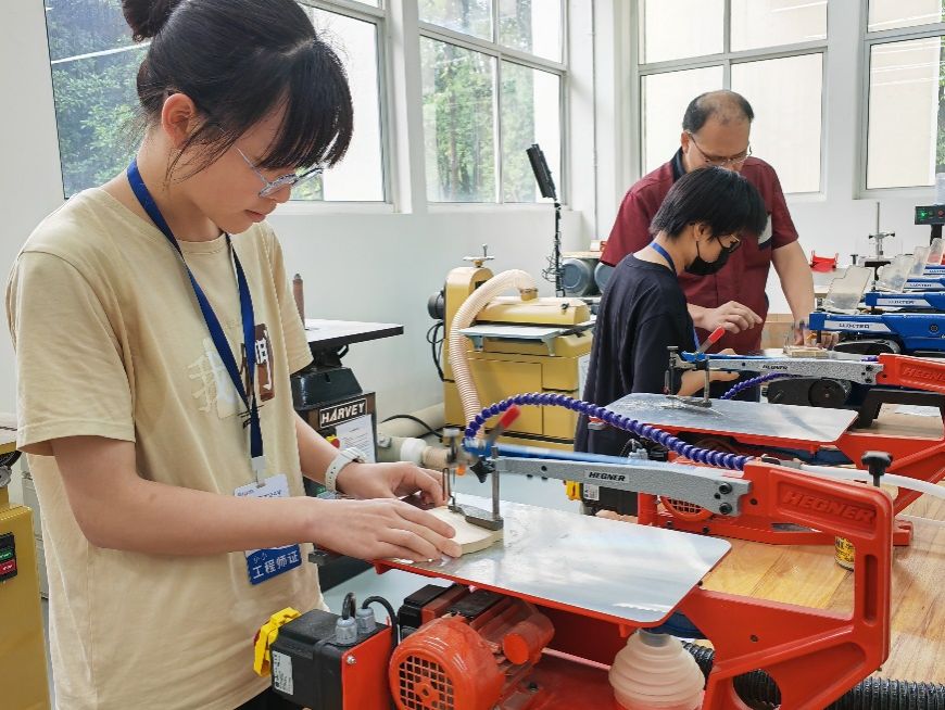 当天下午,同学们来到工程训练中心参观了木艺,激光,焊接,3D打印等加工间,老师对一些精美的加工样品以及高科技产品进行了相关介绍,同学们学习、了解了现代工艺流程的一些基础知识,对现代实际工程技术有了新的认识与理解。而后通过分组亲自动手完成了木艺和激光的操作体验,实现了激光打印亚克力板和木艺搭建牵张结构的实操,丰富了大家工程操作的实际经验。