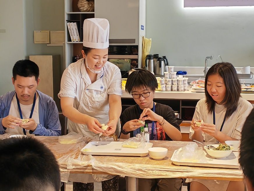 在校园餐厅,同学们亲手体验手工馄饨的制作,体验美食的来之不易。
