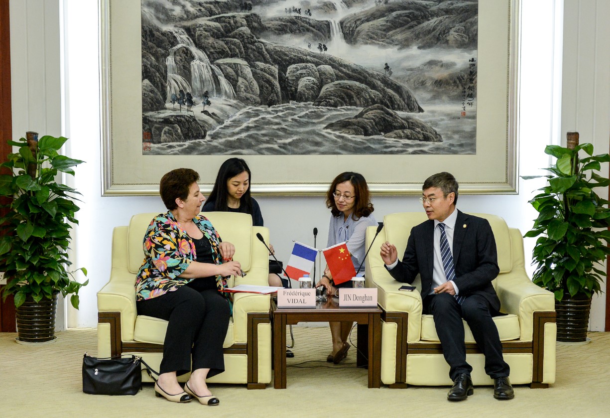 On the morning of June 23, Mrs.Frédérique VIDAL, French Minister of Higher Education, Research and Innovation, led a delegation of French higher education to visit Shanghai University. Mr. Jin Donghan, Party Secretary and President of Shanghai University and Mrs. Wu Minghong, Vice President of Shanghai University, hosted the guests at the VIP Lounge of the International Conference Center. Mr. Cui Wei, Deputy Minister of the International Department and Director of the International Cooperation, Mr. Liu Yi, Deputy Director of the International Cooperation and Mr. Liu Wanyu, Dean of Sino-French School of Engineering, or UTSEUS, attended the meeting.