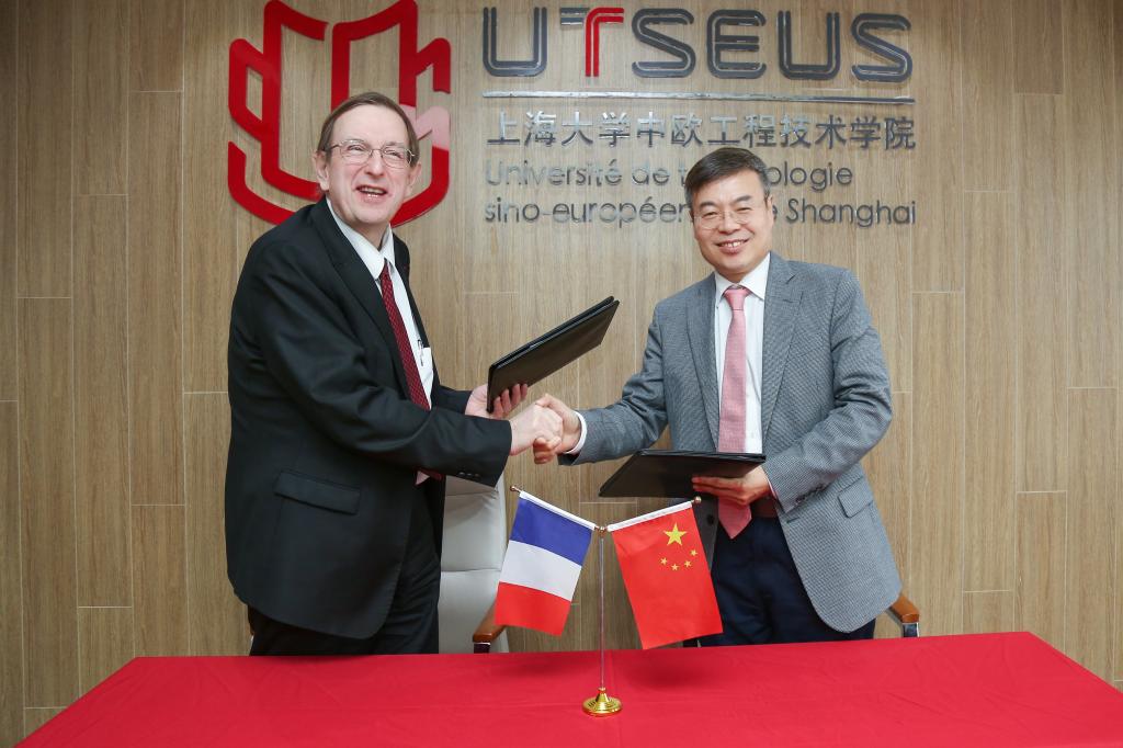 À l'issue de cette réunion, Jin Donghan, président de l'Université de Shanghai, et Philippe COURTIER, président de l'Université de technologie de Compiègne, ont signé une convention sur la création du programme de double diplôme au sein de l’UTSEUS. Compte tenu de la coopération de bonne base entre les deux parties depuis plus de dix ans, ils ont convenu de prolonger l'accord de coopération de l’UTSEUS pour une durée de 20 ans à compter de 2025. Les deux parties créeront un groupe de travail chargé de finaliser la signature d'un nouvel accord coopératif d'ici la fin de 2020.